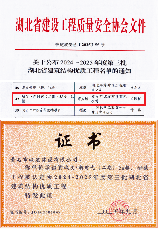 此次荣获省级双项大奖,不仅是对城发·新时代项目在安全文明管理和质量管控工作的充分肯定,更是对城发建工品牌的高度赞誉。它彰显了项目部以“安全第一、质量至上”为核心的价值导向,以及“建工铁军”精神的传承。奋楫正当时,扬帆再出发。城发建设公司将珍惜荣誉,再接再厉,继续秉持匠心建造的理念,开拓进取。我们将以现场优质履约为基石,为业主交付满意工程,擦亮黄石区域建筑领域的金字招牌,树立“品质城发”品牌形象,全心全意为城发集团改革转型高质量发展贡献建工力量。